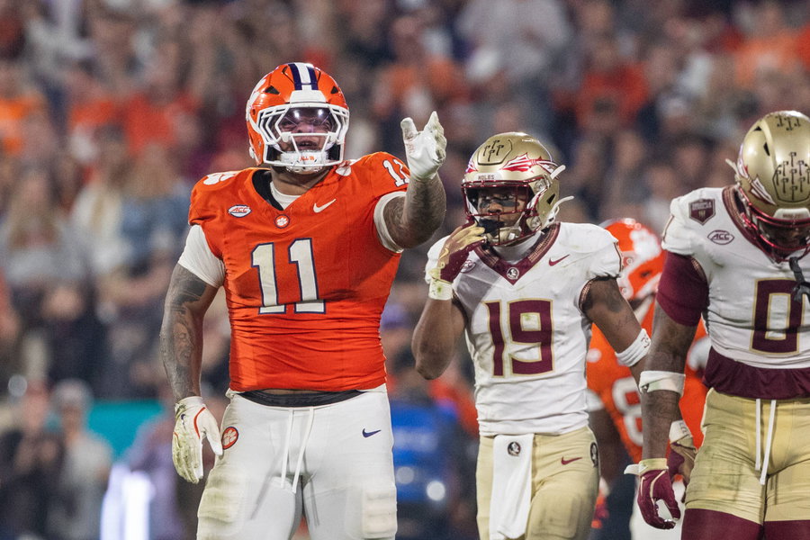 NCAA, College League, USA Football 2025: Florida State At Clemson Nov 08 November 8, 2025: Clemson Tigers defensive tackle Peter Woods 11 celebrates after getting a first down against the Florida State Seminoles in the second half of the NCAA Football matchup at Memorial Stadium in Clemson, SC. Scott Kinser/CSM Credit Image: Scott Kinser/Cal Media Clemson Sc United States EDITORIAL USE ONLY Copyright: xx ZUMA-20251108_zma_c04_241.jpg ScottxKinserx csmphotothree440242