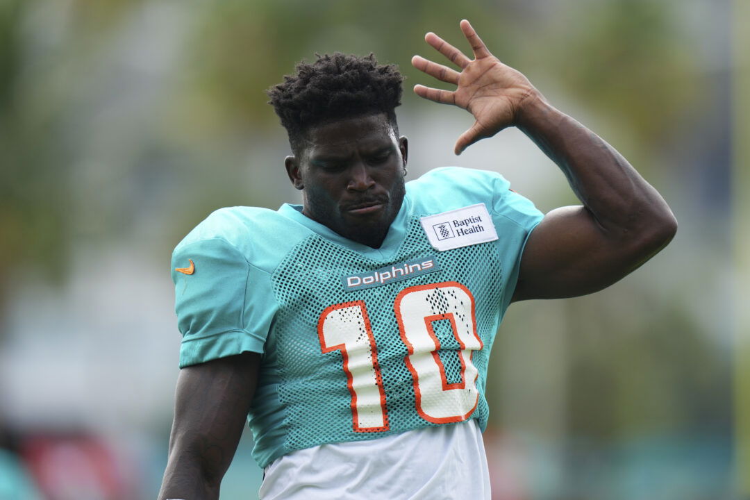 MIAMI GARDENS, FLORIDA – AUGUST 07: Tyreek Hill #10 of the Miami Dolphins looks on during training camp practice with the Atlanta Falcons on August 07, 2024 in Miami Gardens, Florida. (Photo by Rich Storry/Getty Images)