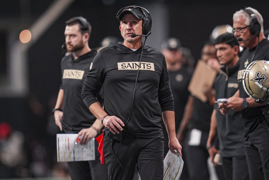 Sep 29, 2024; Atlanta, Georgia, USA; New Orleans Saints head coach Dennis Allen on the sideline during the game against the Atlanta Falcons at Mercedes-Benz Stadium. Mandatory Credit: Dale Zanine-Imagn Images