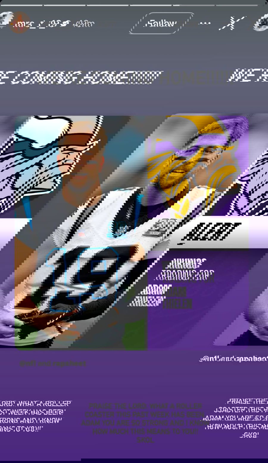 “We’re Coming Home,” declared Caitlin Thielen with the three words on her Instagram story that send a sayonara to Carolina and a roaring welcome back to Minnesota. She further added, “Praise the lord. What a rollercoaster this past week has been. Adam, you are so strong, and I know how much this means to you!! SKOL.”