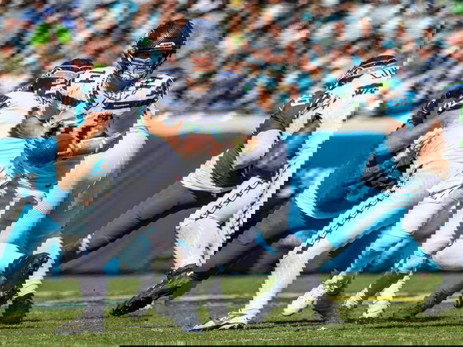 October 12, 2025: Seattle Seahawks quarterback Sam Darnold 14 in the second half during a game against the Jacksonville Jaguars in Jacksonville, FL. Romeo T Guzman/Cal Media Jacksonville, USA – ZUMAcg2_ 20251012_faf_cg2_038 Copyright: xRomeoxGuzmanx
