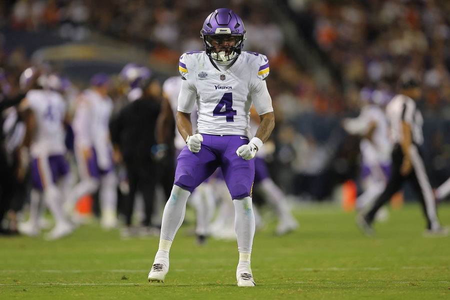 CHICAGO, IL – SEPTEMBER 08: Rondale Moore 4 of the Minnesota Vikings celebrates after a play during the second half against the Chicago Bears on September 8, 2025 at Solider Field in Chicago, Illinois. Photo by Melissa Tamez/Icon Sportswire NFL, American Football Herren, USA SEP 08 Vikings at Bears EDITORIAL USE ONLY Icon250908030