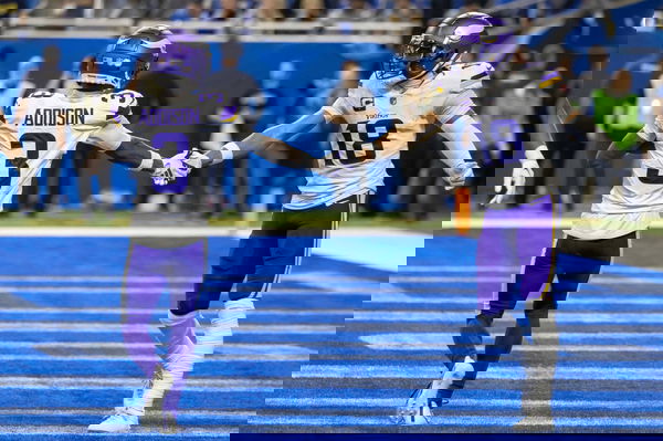NFL, American Football Herren, USA Minnesota Vikings at Detroit Lions Jan 7, 2024 Detroit, Michigan, USA Minnesota Vikings wide receiver Jordan Addison 3 catches a pass for a touchdown and celebrates with wide receiver Justin Jefferson 18 during second half of the game against the Detroit Lions at Ford Field. Detroit Ford Field Michigan USA, EDITORIAL USE ONLY PUBLICATIONxINxGERxSUIxAUTxONLY Copyright: xDavidxReginekx 20240107_neb_kd7_559