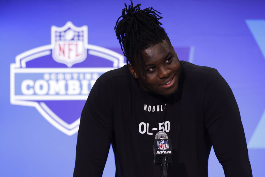 INDIANAPOLIS, INDIANA – MARCH 02: Amarius Mims #OL50 of the Georgia speaks to the media during the 2024 NFL Combine at the Indiana Convention Center on March 02, 2024 in Indianapolis, Indiana. (Photo by Justin Casterline/Getty Images)