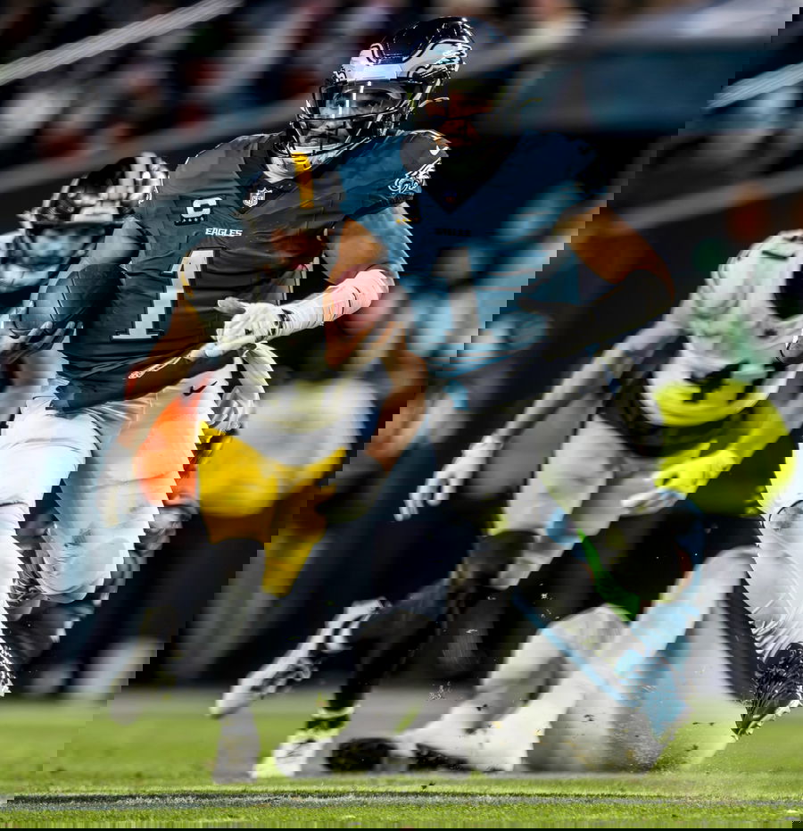 December 15, 2024, Philadelphia, Pa, USA: Philadelphia Eagles quarterback Jalen Hurts 1 runs the ball for a first down during the NFL, American Football Herren, USA football matchup between the Pittsburgh Steelers and the Philadelphia Eagles at Lincoln Financial Field in Philadelphia, Pennsylvania on December 15, 2024. /Cal Media Philadelphia USA – ZUMAcs17 20241215_faf_cs17_054 Copyright: xScottxSeriox
