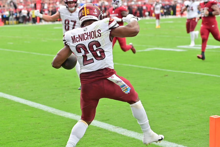 Washington Commanders running back Jeremy McNichols (26) scores a touchdown in the first half against the Arizona Cardinals at State Farm Stadium. Mandatory Credit: Matt Kartozian-Imagn Images