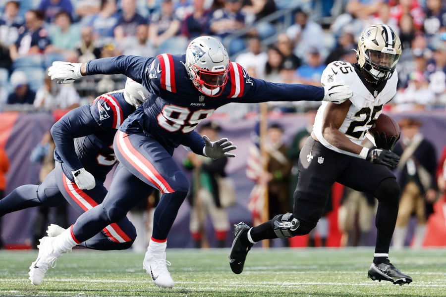 FOXBOROUGH, MASSACHUSETTS – OCTOBER 08: Keion White #99 of the New England Patriots pursues Kendre Miller #25 of the New Orleans Saints during the fourth quarter at Gillette Stadium on October 08, 2023 in Foxborough, Massachusetts. (Photo by Winslow Townson/Getty Images)