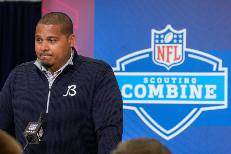 2026 NFL, American Football Herren, USA Combine – Media Availability of Teams General Manager and Head Coach Chicago Bears general manager Ryan Poles takes a question during the 2026 NFL Combine Media Availability at Indiana Convention Center on Feb 24 in Indianapolis, IN. Max Siker / Image of Indianapolis Indiana United States EDITORIAL USE ONLY Copyright: xImagexofxSportx MaxxSikerx iosphotos396730