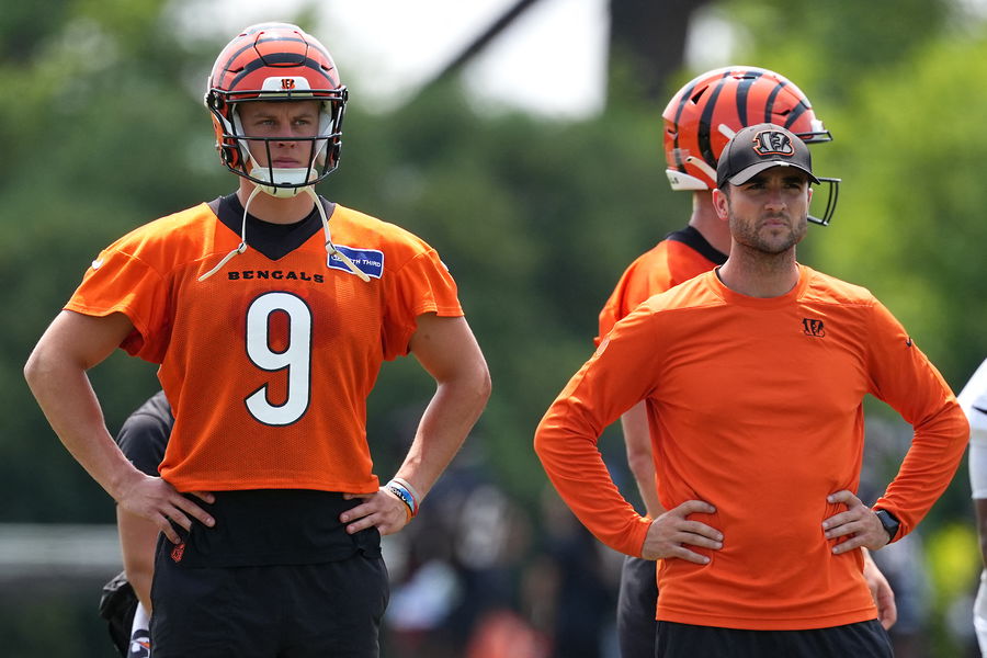Jul 26, 2024; Cincinnati, OH, USA; Cincinnati Bengals quarterback Joe Burrow (9), who did not throw, observes practice with quarterbacks coach Brad Kragthorpe during training camp practice at Kettering Health Practice Fields. Mandatory Credit: Kareem Elgazzar-USA TODAY Sports