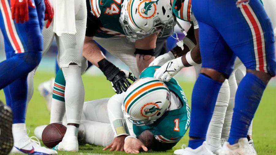 Miami Dolphins quarterback Tua Tagovailoa is assisted on the field during the second half of the Dolphins’ game against the Buffalo Bills in Miami Gardens, Fla., on Thursday.Rebecca Blackwell / AP