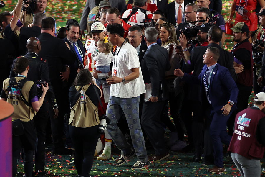 GLENDALE, ARIZONA – FEBRUARY 12: Patrick Mahomes #15 of the Kansas City Chiefs celebrates with his daughter Sterling Skye Mahomes and brother Jackson Mahomes after the Kansas City Chiefs beat the Philadelphia Eagles in Super Bowl LVII at State Farm Stadium on February 12, 2023 in Glendale, Arizona. (Photo by Sarah Stier/Getty Images)