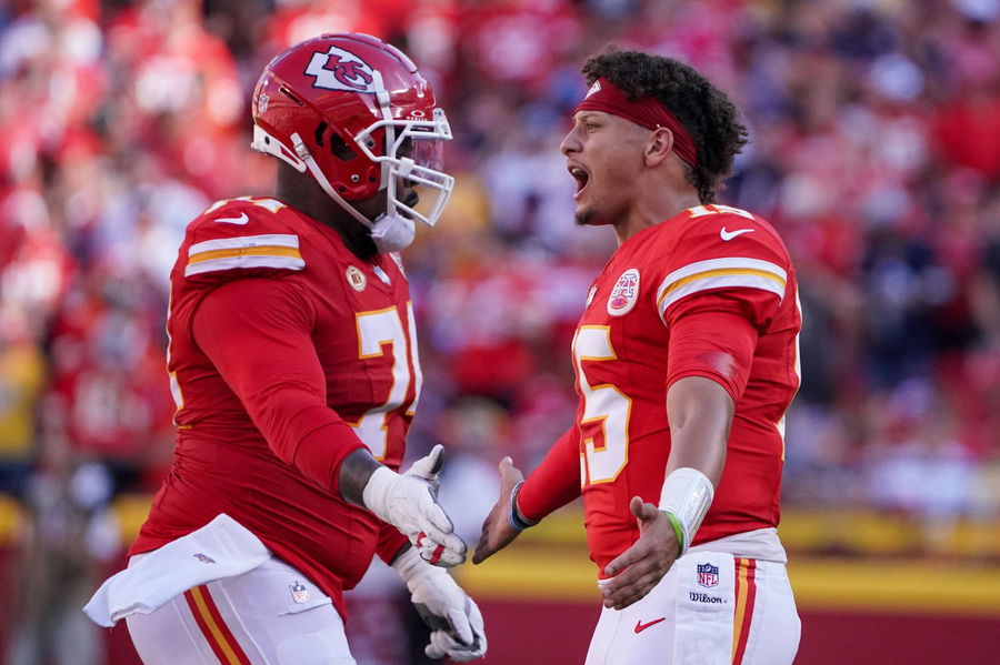 NFL, American Football Herren, USA Chicago Bears at Kansas City Chiefs Sep 24, 2023; Kansas City, Missouri, USA; Kansas City Chiefs quarterback Patrick Mahomes (15) congratulates Kansas City Chiefs offensive tackle Jason Godrick (72) after a score during the first half at GEHA Field at Arrowhead Stadium. Kansas City GEHA Field at Arrowhead Stadium Missouri USA, EDITORIAL USE ONLY PUBLICATIONxINxGERxSUIxAUTxONLY Copyright: xDennyxMedleyx 20230924_tdc_sm8_0489