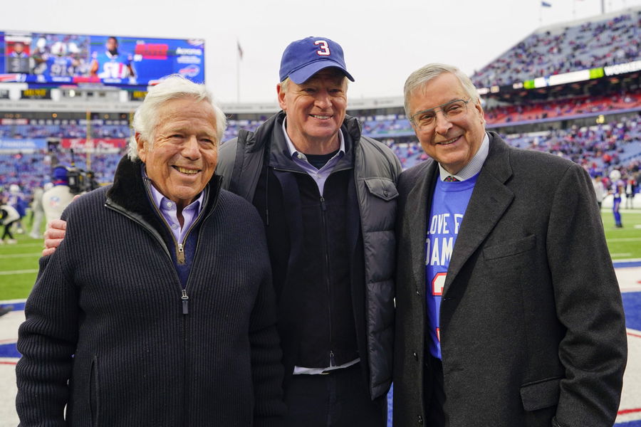 NFL, American Football Herren, USA New England Patriots at Buffalo Bills Jan 8, 2023 Orchard Park, New York, USA New England Patriots owner Robert Kraft, NFL Commissioner Roger Goodell and Buffalo Bills owner Terry Pegula pose for a photo prior to the game between the Buffalo Bills and the New England Patriots at Highmark Stadium. Orchard Park Highmark Stadium New York USA, EDITORIAL USE ONLY PUBLICATIONxINxGERxSUIxAUTxONLY Copyright: xGregoryxFisherx 20230108_gav_fb5_014