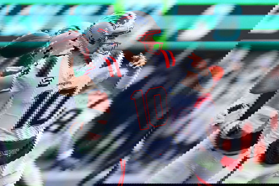 EAST RUTHERFORD, NJ – DECEMBER 28: Drake Maye 10 of the New England Patriots passes during the game against the New York Jets on December 28, 2025 at MetLife Stadium in East Rutherford, New Jersey. Photo by Rich Graessle/Icon Sportswire NFL, American Football Herren, USA DEC 28 Patriots at Jets EDITORIAL USE ONLY Icon25122821852