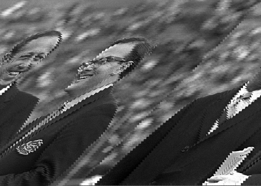 SUPER BOWL IV Jan. 11, 1970 New Orleans, LA, USA FILE PHOTO NFL, American Football Herren, USA commissioner Pete Rozelle left visits with Kansas City Chiefs owner Lamar Hunt prior to the game with the Minnesota Vikings for Super Bowl IV at Tulane Stadium. The Chiefs won the game, 23-9. New Orleans Louisana UNITED STATES, EDITORIAL USE ONLY PUBLICATIONxINxGERxSUIxAUTxONLY Copyright: xRodxHanna-USAxTODAYxSportsx 4219938