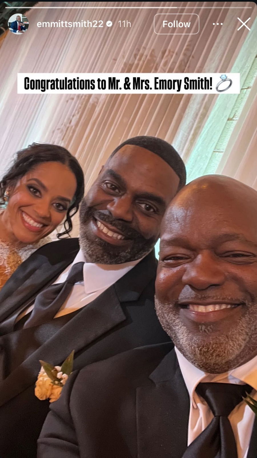“Congratulations to Mr. & Mrs. Emory Smith! 💍,” Emmitt Smith wrote in the caption of his recent Instagram story.