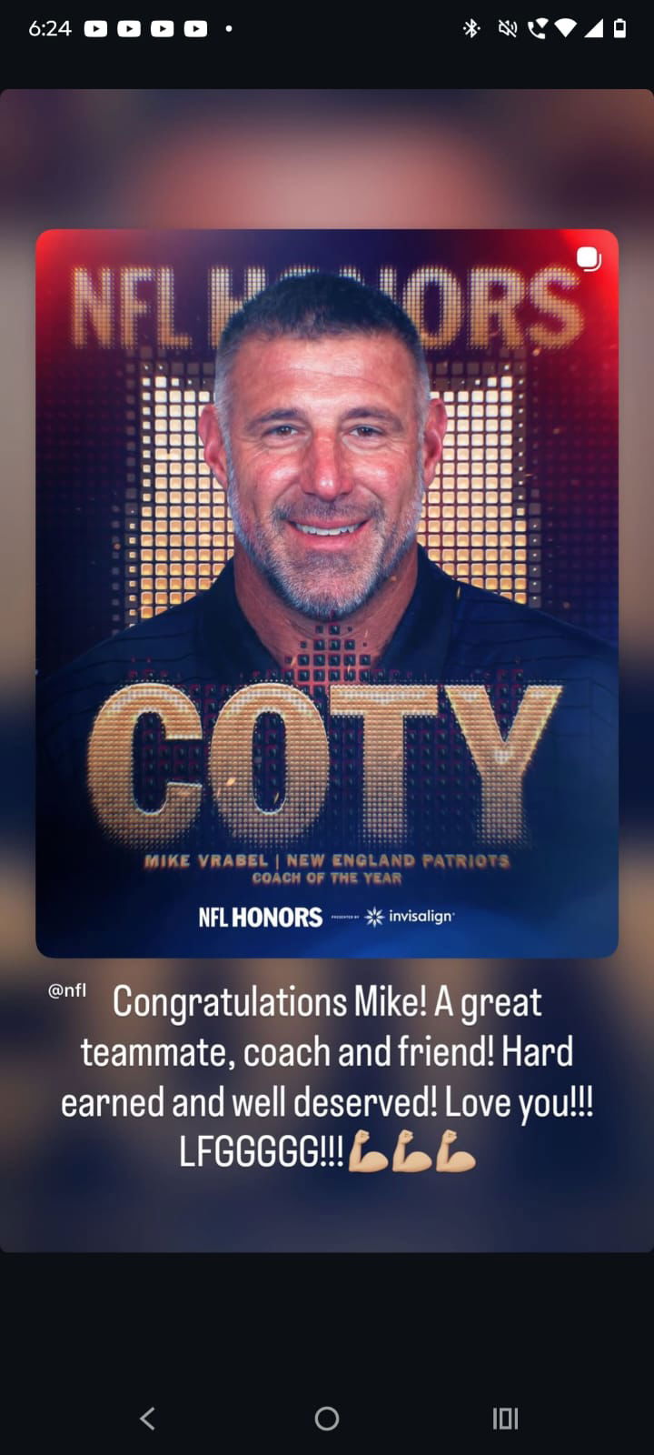 “Congratulations Mike! A great teammate, coach and friend! Hard earned and well deserved! Love you!!! LFGGGGG!!!” Brady shared on his Instagram story on Friday after Vrabel won the Coach of the Year honors.