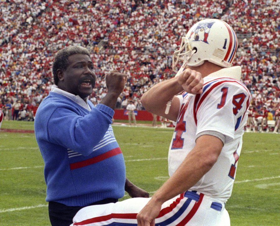 October 22, 1989 – Stanford, California, U.S – San Francisco 49ers vs New England Patriots at Stanford Stadium Sunday, October 22, 1989. 49ers Beat Patriots 37-20. Offensive backfield coach Bobby Grier and Patriots quarterback Steve Grogan. NFL American Football Herren USA 1989: 49ers 37:20 Patriots – ZUMAg228 19891022_zap_g228_013 Copyright: xEvanxGolubx