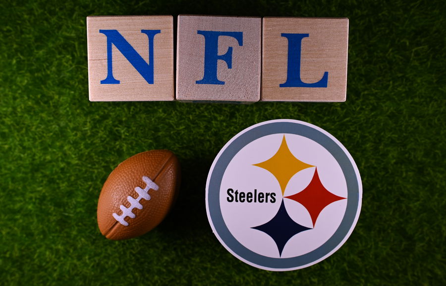 January 27, 2023, Canton, USA. The emblem of the Pittsburgh Steelers football club on the green lawn of the stadium. Model Released Property Released xkwx division new ncaa sporting yardline green superbowl equipment american football lii eagles minnesota minneapolis patriots nfl football league stadium super bowl sports american team super bowl field college game national grass line turf arena touchdown background winner competition white professional sport play athletics ball yard illustration
