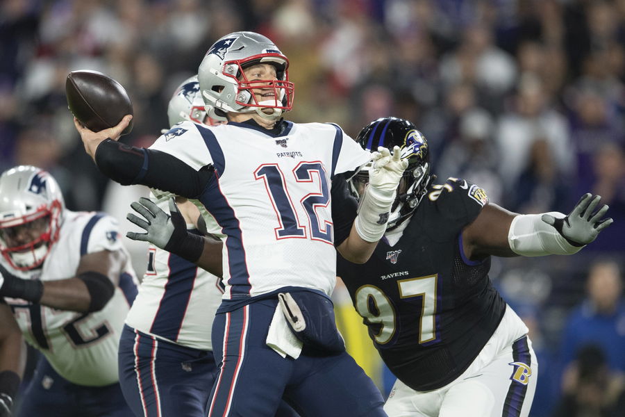 NFL, American Football Herren, USA New England Patriots at Baltimore Ravens, Nov 3, 2019 Baltimore, MD, USA New England Patriots quarterback Tom Brady 12 throws during the first half against the Baltimore Ravens at M&T Bank Stadium. Mandatory Credit: Tommy Gilligan-USA TODAY Sports, 03.11.2019 20:36:14, 13640344, NPStrans, New England Patriots, M&T Bank Stadium, NFL, Baltimore Ravens, Tom Brady PUBLICATIONxINxGERxSUIxAUTxONLY Copyright: xTommyxGilliganx 13640344