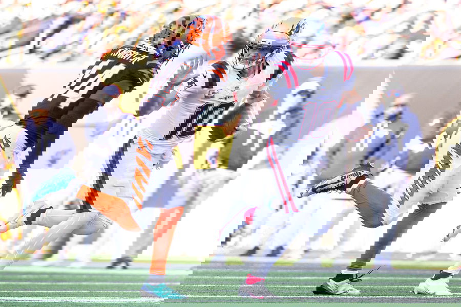 November 23, 2025: New England Patriots quarterback Drake Maye 10 runs with the ball as Cincinnati Bengals linebacker Demetrius Knight Jr. 44 pursues during NFL, American Football Herren, USA game action at Paycor Stadium in Cincinnati, Ohio. /CSM Cincinnati United States of America – ZUMAc04_ 20251123_zma_c04_566 Copyright: xJohnxMersitsx