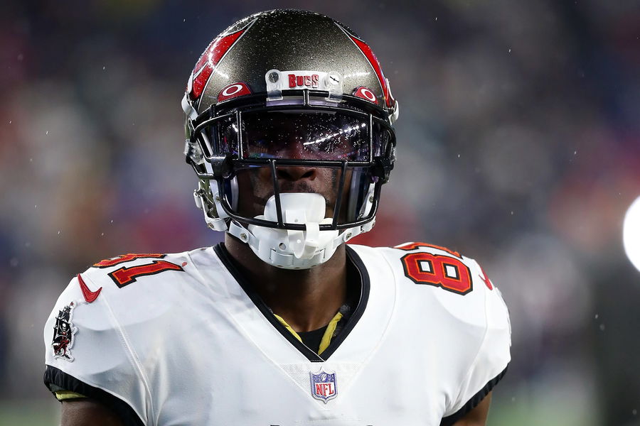 FOXBOROUGH, MA – OCTOBER 03: Tampa Bay Buccaneers wide receiver Antonio Brown 81 warms up before the regular season game between the Tampa Bay Buccaneers and the New England Patriots on October 03, 2021 at Gillette Stadium in Foxborough, MA. Photo by Cliff Welch/Icon Sportswire NFL, American Football Herren, USA OCT 03 Buccaneers at Patriots Icon357211003107