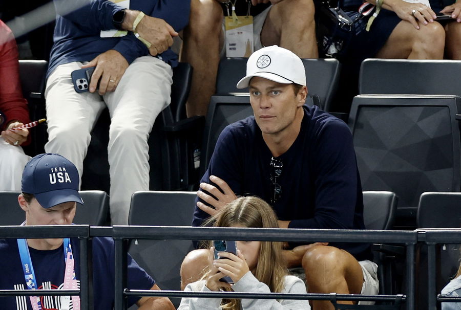 Paris 2024 Olympics – Artistic Gymnastics – Women’s Floor Exercise Final – Bercy Arena, Paris, France – August 05, 2024. Former football quarterback Tom Brady in the stands. REUTERS/Peter Cziborra