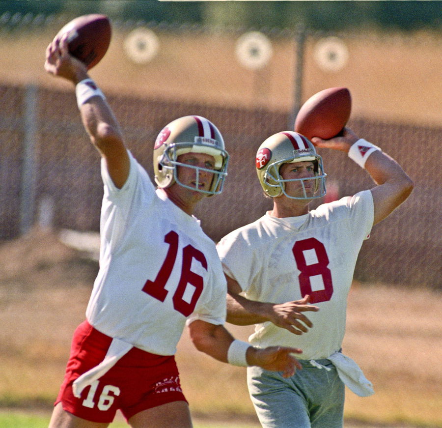 July 26, 1990 – Rocklin, California, U.S – San Francisco 49ers training camp July 26, 1990 at Sierra College, Rocklin, California. San Francisco 49ers quarterback Joe Montana (16) and quarterback Steve Young NFL American Football Herren USA 1990: 49ers Camp – ZUMAg52_ 19900726_zap_g52_007 Copyright: xAlxGolubx