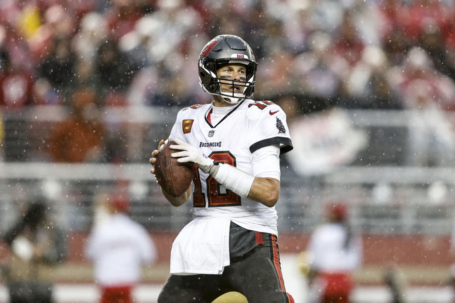 SANTA CLARA, CALIFORNIA – DECEMBER 11: Tom Brady #12 of the Tampa Bay Buccaneers looks to pass during an NFL football game between the San Francisco 49ers and the Tampa Bay Buccaneers at Levi’s Stadium on December 11, 2022 in Santa Clara, California. (Photo by Michael Owens/Getty Images)