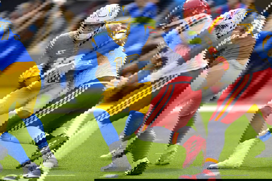 NFL, American Football Herren, USA Kansas City Chiefs at Los Angeles Chargers Sep 29, 2024 Inglewood, California, USA Los Angeles Chargers quarterback Justin Herbert 10 is sacked by Kansas City Chiefs defensive tackle Chris Jones 95 in the first half at SoFi Stadium. Inglewood SoFi Stadium California USA, EDITORIAL USE ONLY PUBLICATIONxINxGERxSUIxAUTxONLY Copyright: xJaynexKamin-Onceax 20240929_jko_aj4_073