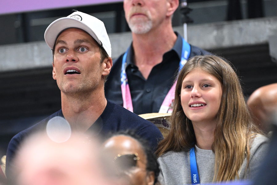 Paris 2024 Olympics – Volleyball – Men’s Quarterfinals – United States vs Brazil – South Paris Arena 1, Paris, France – August 05, 2024. Former NFL player Tom Brady attends the match with his daughter Vivian REUTERS/Annegret Hilse