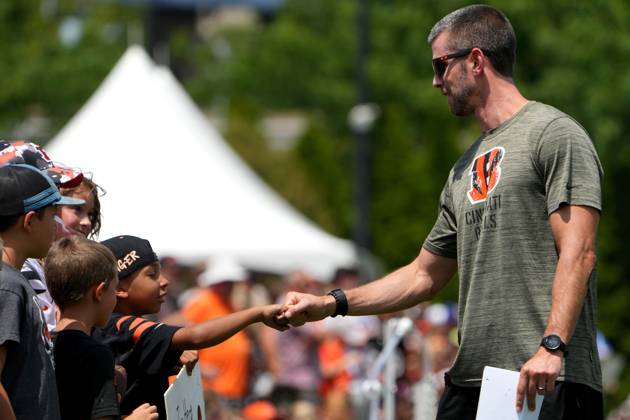 NFL, American Football Herren, USA Cincinnati Bengals Training Camp July 31, 2023 Cincinnati, OH, USA Cincinnati Bengals secondary/safeties coach Robert Livingston fist bumps a young fan during NFL training camp practice, Monday, July 31, 2023, in Cincinnati. Cincinnati Ohio USA, EDITORIAL USE ONLY PUBLICATIONxINxGERxSUIxAUTxONLY Copyright: xKareemxElgazzarx 0300732403st