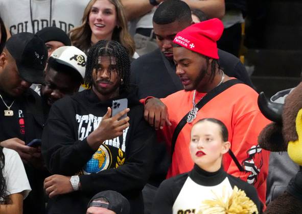 NCAA, College League, USA Womens Basketball: UCLA at Colorado Jan 19, 2024 Boulder, Colorado, USA Colorado Buffaloes football players quarterback Shedeur Sanders center and freshman offensive tackle Jordan Seaton right during the fourth quarter against the UCLA Bruins at the CU Events Center. Boulder CU Events Center Colorado USA, EDITORIAL USE ONLY PUBLICATIONxINxGERxSUIxAUTxONLY Copyright: xRonxChenoyx 20240119_gav_ac4_273