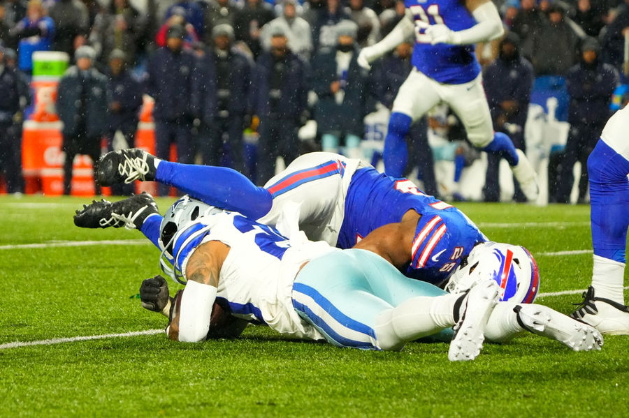 Dec 17, 2023; Orchard Park, New York, USA; Buffalo Bills linebacker Tyrel Dodson (25) tackles Dallas Cowboys running back Tony Pollard (20) in the second half at Highmark Stadium. Mandatory Credit: Gregory Fisher-USA TODAY Sports