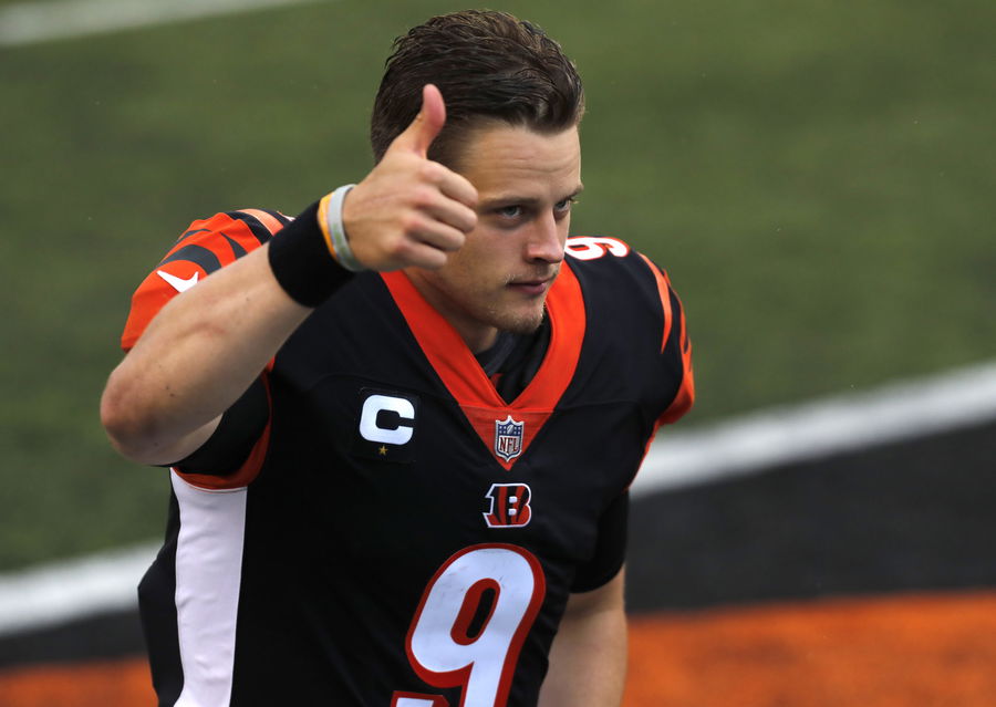 Oct 4, 2020; Cincinnati, Ohio, USA; Cincinnati Bengals quarterback Joe Burrow (9) reacts after the Bengals defeated the Jacksonville Jaguars at Paul Brown Stadium. Mandatory Credit: David Kohl-USA TODAY Sports