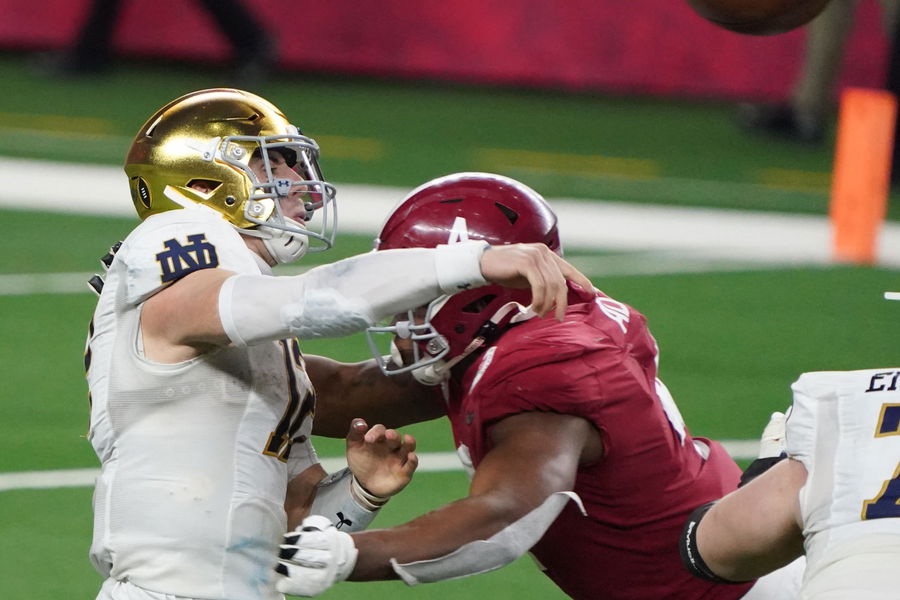 Jan 1, 2021; Arlington, TX, USA; Notre Dame Fighting Irish quarterback Ian Book (12) passes under pressure from Alabama Crimson Tide linebacker Christopher Allen (4) in the fourth quarter during the Rose Bowl at AT&T Stadium. Mandatory Credit: Kirby Lee-USA TODAY Sports