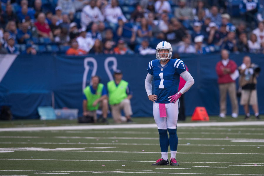 October 9, 2016: Indianapolis Colts punter Pat McAfee (1) watches a video replay of his punt during the NFL game between the Chicago Bears and Indianapolis Colts at Lucas Oil Stadium in Indianapolis, IN. (Photo by Zach Bolinger/Icon Sportswire via Getty Images)