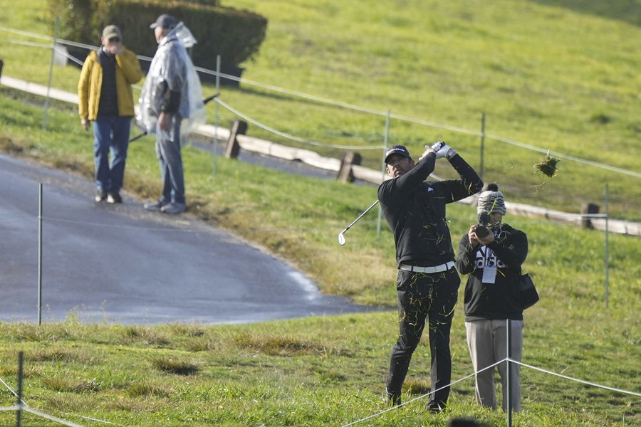 Feb 5, 2023; Pebble Beach, California, USA; Aaron Rodgers plays his shot from out of bounds on the fourteenth hole during the third round of the AT&T Pebble Beach Pro-Am golf tournament at Pebble Beach Golf Links. Mandatory Credit: Ray Acevedo-USA TODAY Sports