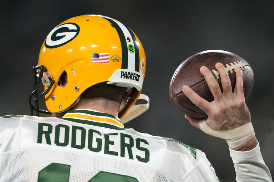 GREEN BAY, WISCONSIN – NOVEMBER 17: Aaron Rodgers #12 of the Green Bay Packers warms up prior to the game against the Tennessee Titans at Lambeau Field on November 17, 2022 in Green Bay, Wisconsin. (Photo by Patrick McDermott/Getty Images)