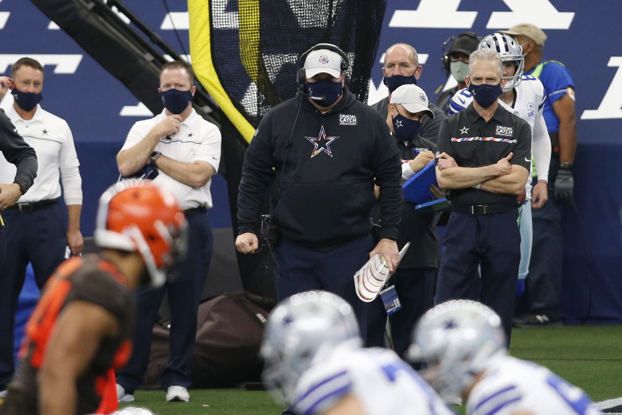 Oct 4, 2020; Arlington, Texas, USA; Dallas Cowboys head coach Mike McCarthy watches a play in the game against the Cleveland Browns at AT&T Stadium. Mandatory Credit: Tim Heitman-USA TODAY Sports