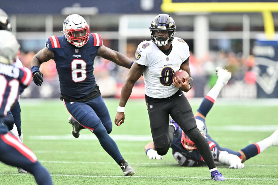 Sep 25, 2022; Foxborough, Massachusetts, USA; Baltimore Ravens quarterback Lamar Jackson (8) runs with the ball in front of New England Patriots linebacker Ja’Whaun Bentley (8) during the second half at Gillette Stadium. Mandatory Credit: Brian Fluharty-USA TODAY Sports