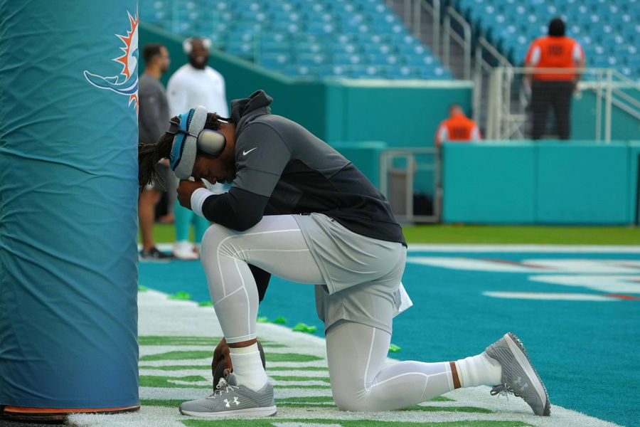 NFL, American Football Herren, USA Carolina Panthers at Miami Dolphins, Nov 28, 2021 Miami Gardens, Florida, USA Carolina Panthers quarterback Cam Newton 1 kneels at the goal post prior to the game against the Miami Dolphins at Hard Rock Stadium. Mandatory Credit: Jasen Vinlove-USA TODAY Sports, 28.11.2021 10:56:41, 17248634, NPStrans, Miami Dolphins, Carolina Panthers, NFL, Cam Newton, TopPic, Hard Rock Stadium PUBLICATIONxINxGERxSUIxAUTxONLY Copyright: xJasenxVinlovex 17248634