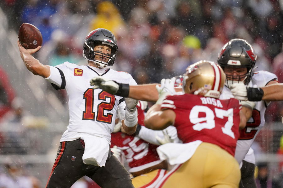 Dec 11, 2022; Santa Clara, California, USA; Tampa Bay Buccaneers quarterback Tom Brady (12) throws a pass against the San Francisco 49ers in the fourth quarter at Levi’s Stadium. Mandatory Credit: Cary Edmondson-USA TODAY Sports
