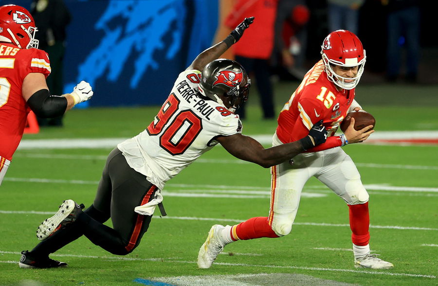 TAMPA, FLORIDA – FEBRUARY 07: Jason Pierre-Paul #90 of the Tampa Bay Buccaneers attempts to tackle Patrick Mahomes #15 of the Kansas City Chiefs in the fourth quarter during Super Bowl LV at Raymond James Stadium on February 07, 2021 in Tampa, Florida. (Photo by Mike Ehrmann/Getty Images)