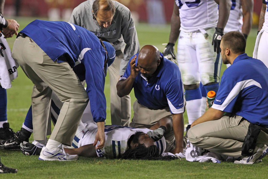 NFL, American Football Herren, USA Indianapolis Colts at Washington Redskins October 17, 2010 Landover, MD, USA Indianapolis Colts running back Joseph Addai 29 is attended to by medical staff during the game against the Washington Redskins at Fed Ex Field. Addai will be diagnosed as having suffered a concussion and would not return. The Colts beat the Redskins 27-24. Landover Maryland UNITED STATES, EDITORIAL USE ONLY PUBLICATIONxINxGERxSUIxAUTxONLY Copyright: xMitchxStringer-USAxTODAYxSportsx 4905474