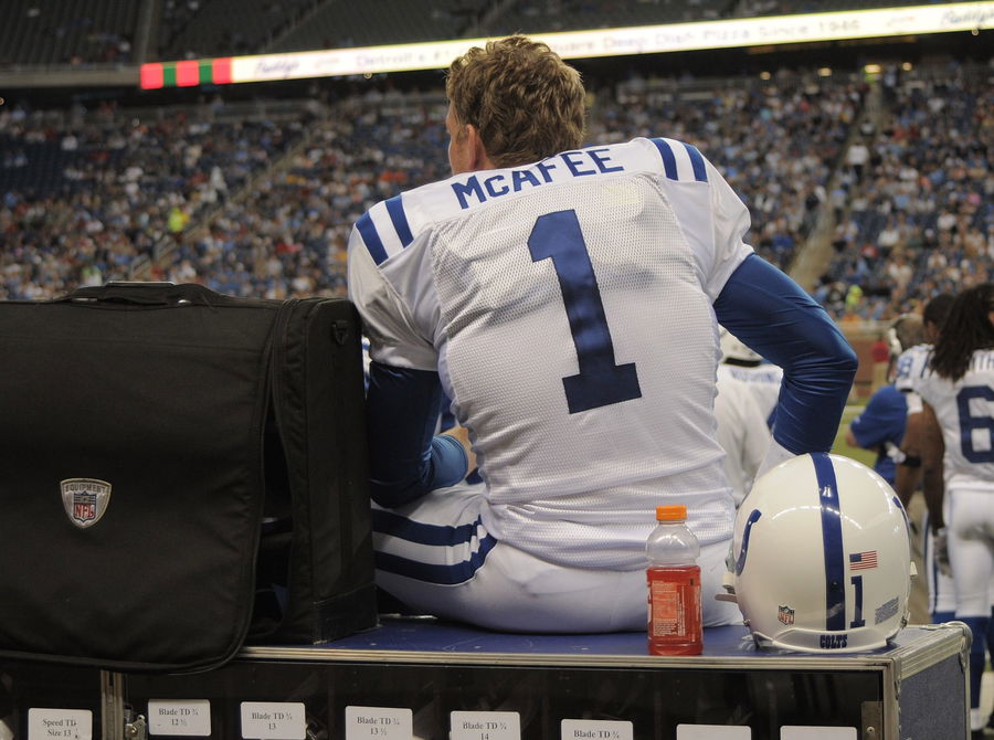DETROIT – AUGUST 29: Pat McAfee #1 of the Indianapolis Colts watches from the sidelines against the Detroit Lions at Ford Field on August 29, 2009 in Detroit, Michigan. The Lions defeated the Colts 18-17. (Photo by Mark Cunningham/Getty Images)