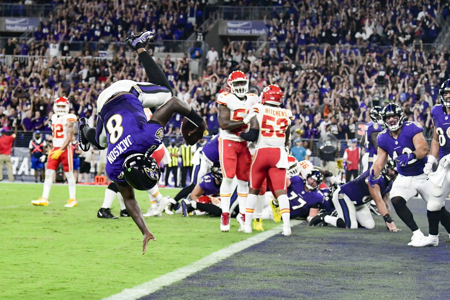 Sep 19, 2021; Baltimore, Maryland, USA; Baltimore Ravens quarterback Lamar Jackson (8) flips into the end zone for a fourth quarter touchdown against the Kansas City Chiefs at M&T Bank Stadium. Mandatory Credit: Tommy Gilligan-USA TODAY Sports