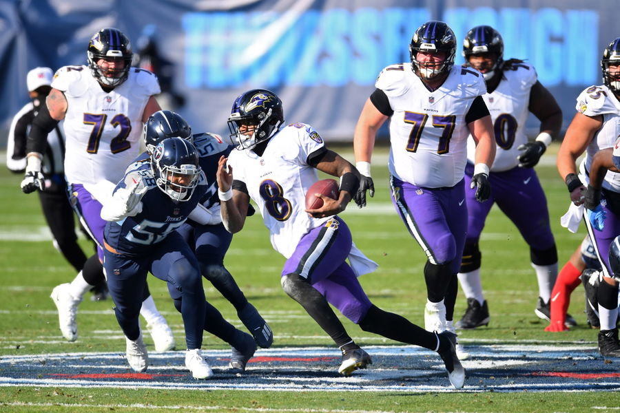 Jan 10, 2021; Nashville, Tennessee, USA; Baltimore Ravens quarterback Lamar Jackson (8) runs the ball for a touchdown against the Tennessee Titans during the second quarter in a AFC Wild Card playoff game at Nissan Stadium. Mandatory Credit: Christopher Hanewinckel-USA TODAY Sports