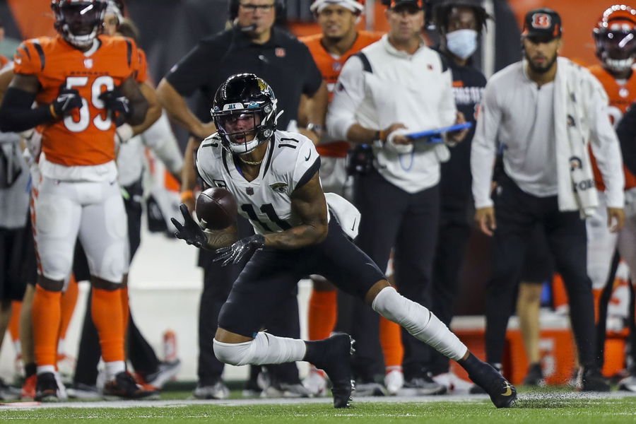 Sep 30, 2021; Cincinnati, Ohio, USA; Jacksonville Jaguars wide receiver Marvin Jones (11) catches a pass against the Cincinnati Bengals in the second half at Paul Brown Stadium. Mandatory Credit: Katie Stratman-USA TODAY Sports| Reuters
