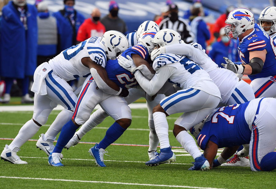 Jan 9, 2021; Orchard Park, New York, USA; Buffalo Bills running back Zack Moss (20) is brought down by Indianapolis Colts defensive end Justin Houston (50) and outside linebacker Darius Leonard (53) during the first half in the AFC Wild Card game at Bills Stadium. Mandatory Credit: Rich Barnes-USA TODAY Sports | Courtesy: Reuters